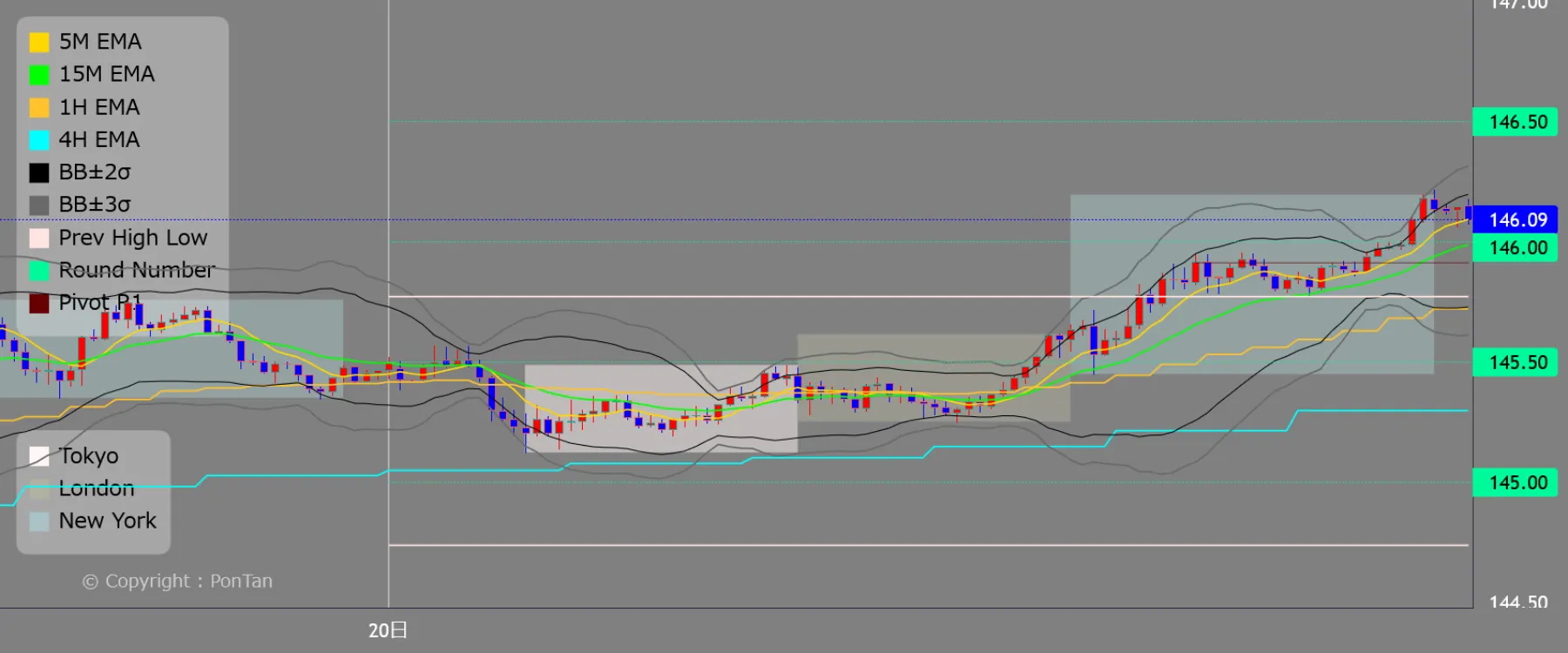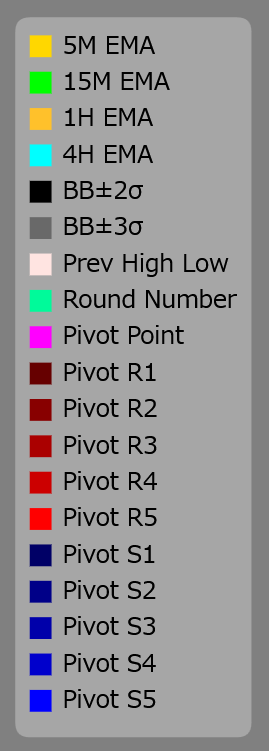 PonTan 图表显示五天内的价格走势,包括日志中记录的当天。 只显示 15 分钟图表。 鼠标滚轮可用于放大和缩小,左右滚动可返回查看过去的价格走势。 垂直线表示日期线,始终可见,但根据缩放系数的不同,底部的日期可能会被省略。 日志当天的图表每 15 分钟自动更新一次。 当日期发生变化时,只有与当天航海日志相对应的海图才会进行后续更新,而其他日期的海图则是固定的。 这样做的目的是 "保留您当天实时查看图表的历史记录"。